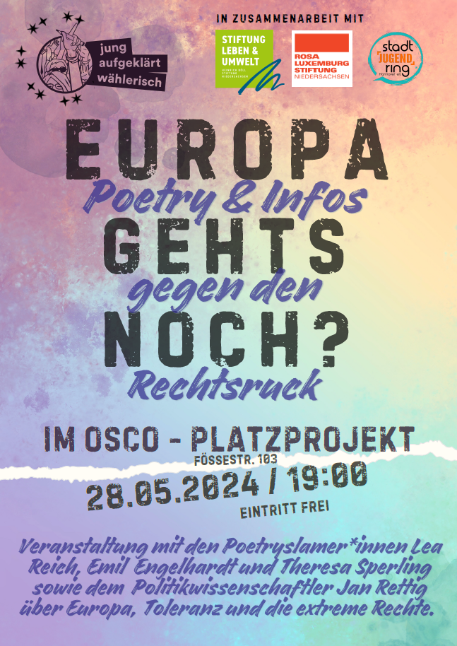 Am Dienstag, den 28.05.2024, ab 19.00 Uhr geht es mit Poetry und Infos gegen den Rechtsruck in Europa und die damit einhergehenden Gefahren für unsere Demokratie.