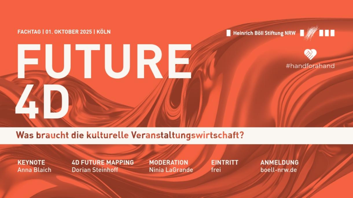 Zwischen Innovationsdruck, Förderlücken und der Suche nach zukunftsfähigen Strukturen: Die Veranstaltungswirtschaft steht aktuell vor enormen Herausforderungen. Welche Antworten braucht es jetzt, um diese zukunftsfähig bewältigen zu können – und wer kann, wer muss wie an diesen Lösungen mitwirken? Unter dem Titel Future 4D: Was braucht die kulturelle Veranstaltungswirtschaft? laden handforahand und die Heinrich Böll Stiftung NRW am Mittwoch, 1. Oktober 2025  zu einem Fachtag  in die wohngemeinschaft  ein, der diese Frage in den Mittelpunkt stellt und Akteur*innen der Branche, Politik, Verwaltung und Förderinstitutionen an einen Tisch bringt.