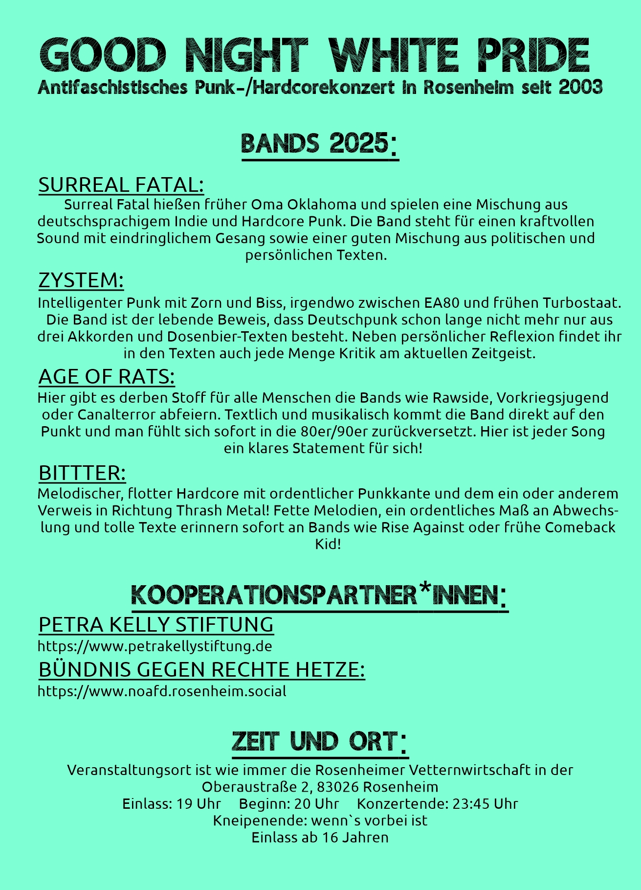 Unter dem Motto „good night – white pride“ findet in der Rosenheimer Vetternwirtschaft (Oberaustr. 2) wieder ein Hardcore-/Punkkonzert statt. Das seit 20 Jahren regelmäßig stattfindende antifaschistische Konzert ist inzwischen eine feste Institution in der oberbayerischen (Sub-)Kulturszene.