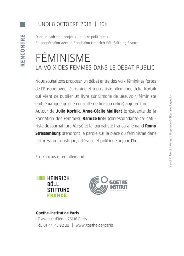 Starke Frauen aus Frankreich, Deutschland und Europa diskutieren zum Feminismus im künstlerischen, literarischen und politischen Ausdruck. Die deutsche Schriftstellerin Julia Korbik spricht mit der türkischen Journalistin Ramize Erer, der deutsch-französischen Journalistin Romy Strassenburg und der Aktivistin Anne-Cécile Mailfert (Präsidentin der Fondation des Femmes).